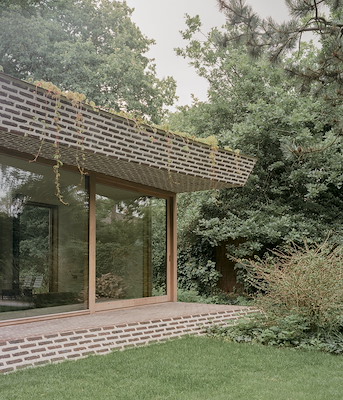 Space Encounters en Studio Vincent Architecturen hebben de van oorsprong bescheiden villa voorzien van een uitbreiding, die zich opent naar de tuin. Het gevoel van wonen in het bos heeft daarmee een nieuwe dimensie gekregen, leggen de architecten uit. De combinatie van het bestaande volume en de uitbreiding creëert een spanning tussen symmetrie en asymmetrie, rechte lijn en curve – een spanning die de architectuur van de oorspronkelijke villa al in zekere mate vertoonde.