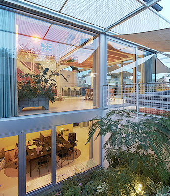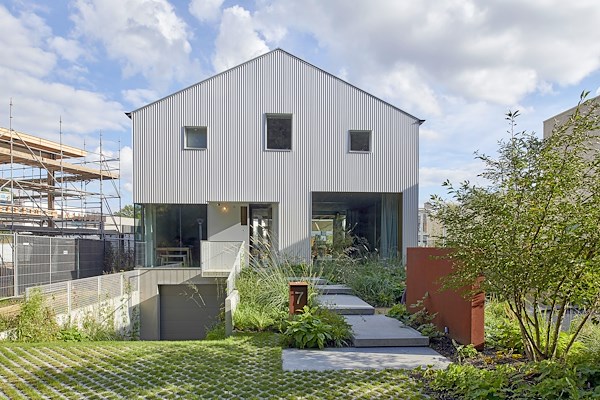 “Als basis hebben we het volume 80 cm boven maaiveld geplaatst en een kelder eronder gemaakt. Dat zijn in verhouding goedkope vierkante meters. De verblijfsruimtes in de kelder zijn door de ramen, die als schietgaten de groene tuin insteken, een soort tuinkamers geworden. De kelder is door middel van open trappen verbonden met de verdiepingen. Het gezin leeft verbonden in het gehele huis maar slapen, werken, spelen en de entree zijn met deuren afsluitbaar, waarmee er ook voor privacy gekozen kan worden.”