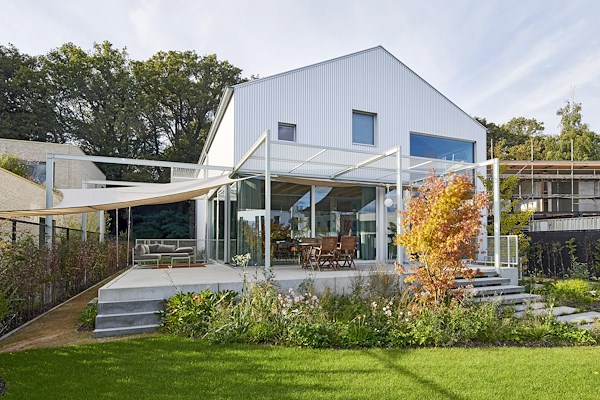 hier een ruimtelijke woning ontworpen die, dankzij een iets opgetilde begane grondvloer, uitkijkt over de omgeving.
