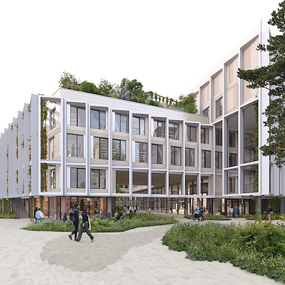 ) aan de natuur zou over laten. Het beeld hiervan is de inspiratie voor het landschapsontwerp geworden”, stellen de ontwerpers. Langs de buitentrap naar de publieke daktuin groeien planten omhoog, zodat er niet alleen voor mensen maar ook voor insecten een verbinding tot stand wordt gebracht tussen maaiveld en daktuin, meldt Kraaijvanger.