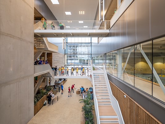 Het sportcomplex wordt doorsneden door een binnenstraat. “De binnenstraat is echt een fysieke en sociale verbinder; licht, hoog, met trappen en loopbruggen, veel groen en natuurlijk een bar. Vanaf hier moedigt zicht op sportende studenten echt aan tot meedoen”, vertelt Manfred Wansink, architect en partner van VenhoevenCS.