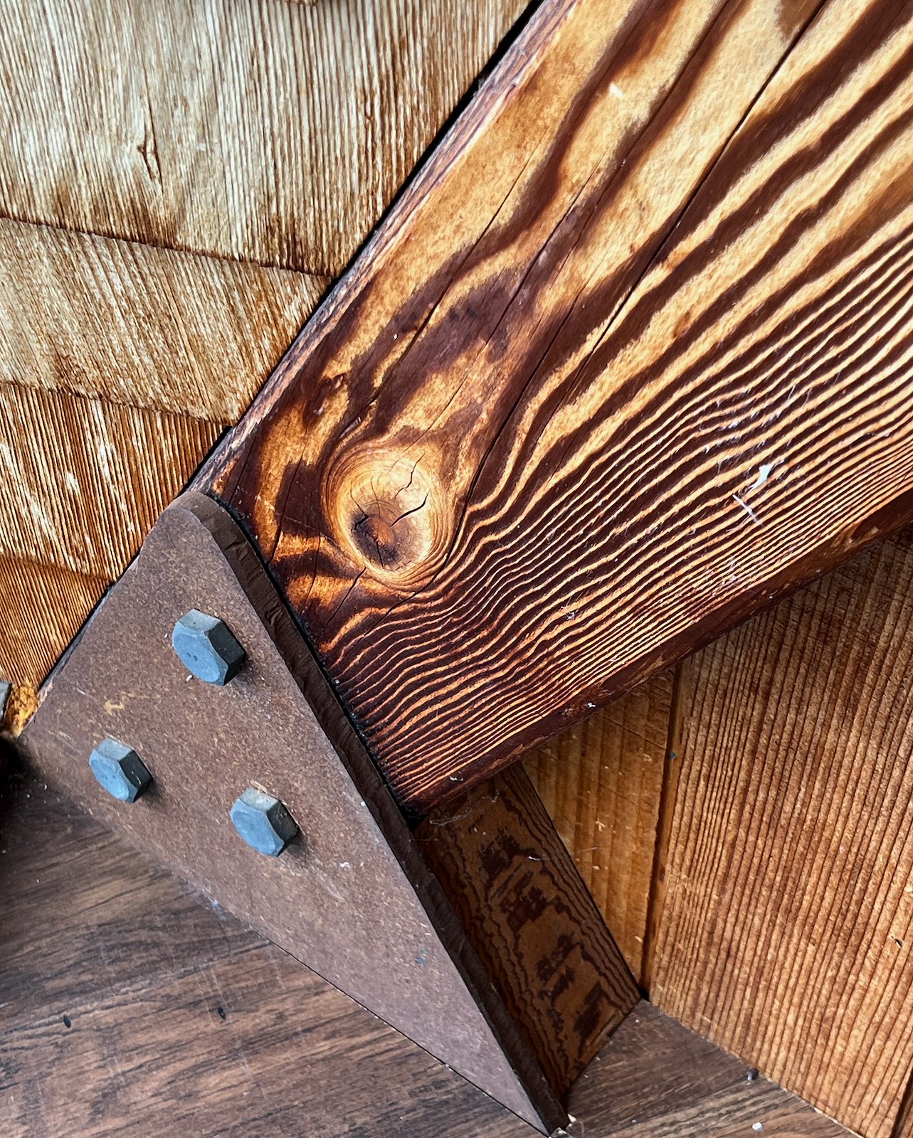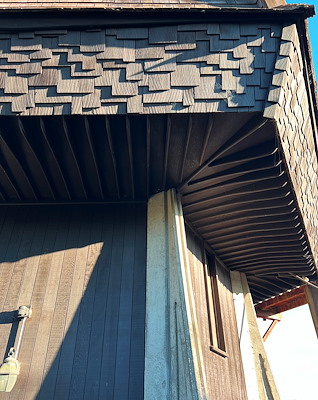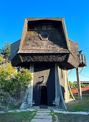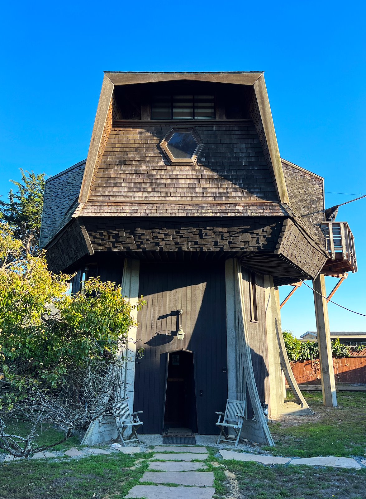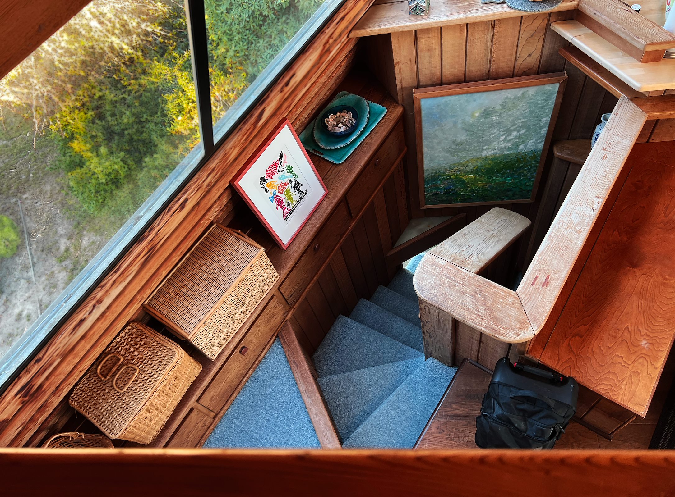 Brody vertelt ons dat het huis nu al voor drie generaties in zijn familie is. Zijn oma kocht het huis in de jaren ‘80 van een visser. Een voormalige leraar had het huis destijds laten ontwerpen door architect Reece Clark Jr. Enig navraag en speurwerk leerde mij dat Reece opgroeide in Berkeley en zich liet inspireren door het werk van Bernard Maybeck en z'n tijdgenoten. Toch gaf hij aan dit huis een eigenzinnige draai die ik niet kan plaatsen in welk referentiekader dan ook.
