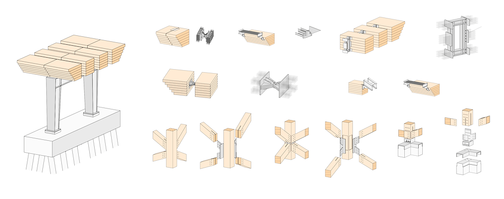 De 1340 millimeter hoge liggers worden in dwarsrichting met koppelstukken aan elkaar bevestigd en gedragen door zwartstalen portalen. Ook de liftschachten en doorlopende leuningen worden in hout uitgevoerd. De houten brug geeft 74 procent minder CO2-uitstoot ten opzichte van een stalen brug, aldus de ontwerpers.