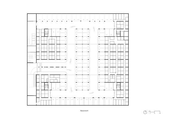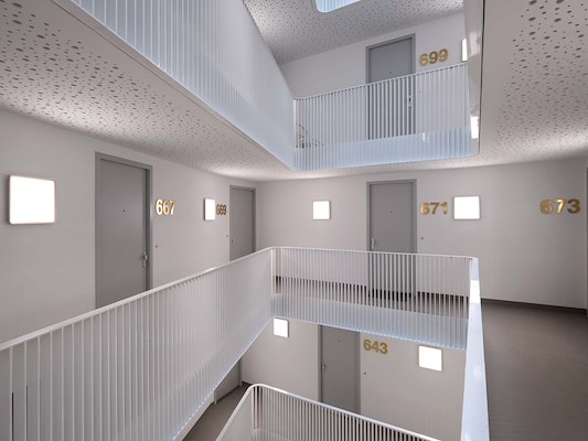 Het complex is gebouwd op twee L-vormige plots. Doordat de volumes zich naar buiten toe verwijden, ontstaat in het midden van de gebouwen ruimte voor interne verkeersruimtes. Deze ruimtes versmallen naar boven toe en bevatten galerijen, trappen en de ontsluitingen voor de woningen. Een daklicht brengt natuurlijk licht naar binnen.