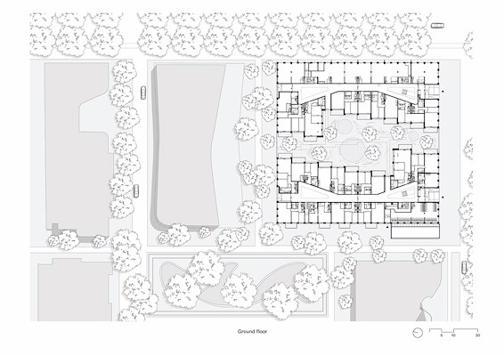 . Rond de tuin stapelen de verspringende balkons zich trapsgewijs op. Deze opzet biedt de bewoners het nodige zonlicht en privacy, meldt KCAP. De individuele balkons zijn voorzien van verticale groene wanden, die tezamen de indruk moeten geven van een doorlopende groene gevel.