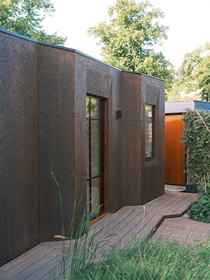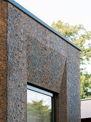 De houtconstructie is uitsluitend bekleed met kurk, een isolatielaag van kurk met een lage dichtheid en een buitenlaag van kurk met een hoge dichtheid, verbonden door twee kurkmortellagen. Op die manier ontstond een gevel die ‘ademt’ en bijdraagt aan een gezond en comfortabel binnenklimaat. Alle kurkmodules zijn computergestuurd gefreesd, wat resulteerde in subtiele overgangen bij de kozijnen en andere elementen.