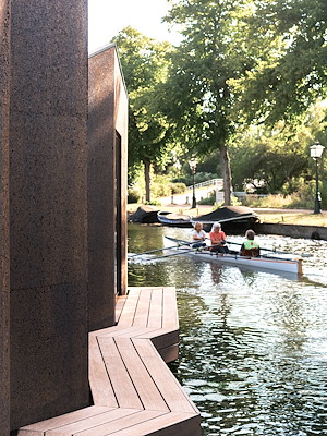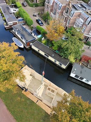 De drijvende woning ligt in een gracht in het historische centrum van Leiden. “Ons ontwerp van de hoofdmassa is gebaseerd op het idee dat de woning uit een reeks woonsferen bestaat. Dit uitgangspunt is daarnaast gebruikt om de woning niet als een massief drijvend object te laten ogen maar als een woning met een prettige menselijke schaal”, laat Studio RAP weten.