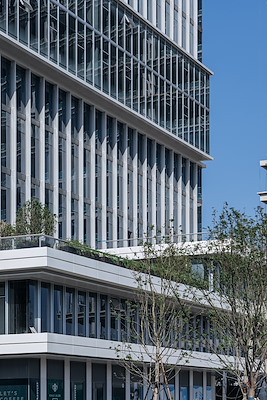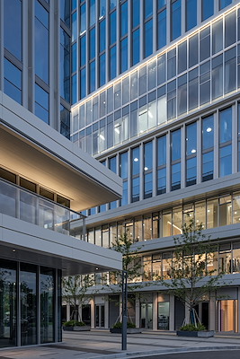 Voor de hoogste verdiepingen van de torens en de naastgelegen lagere kantoorgebouwen is een ingetogen ontwerp toegepast, bestaande uit een glazen gevel met verticale, geperforeerde kolommen waarin tevens de ventilatie voor de binnenruimtes is opgenomen.