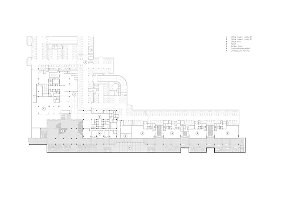 De onderste verdiepingen van de twee torens zijn zowel fysiek als functioneel (horeca en winkels) geïntegreerd met het maaiveld. De verdiepingen daar weer boven hebben uitstekende vloeren, die zorgen voor schaduw en extra terrasruimte. De route vanaf het metrostation loopt uiteindelijk - via de strategisch gepositioneerde (rol)trappen - naar een voetgangersbrug die Sky City TOD verbindt met een naastgelegen kavel met cultuurfuncties.