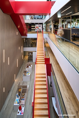 Ook het centrale trappenhuis en de foyer maken deel uit van het gebouwhart. Het trappenhuis heeft een open opzet en dankzij de verspringende vides ontstaat er zicht en meer interactie tussen de verschillende verdiepingen. De rumoerige functies liggen direct rond het trappenhuis, zodat de werkplekken aan gevel meer rust genieten.