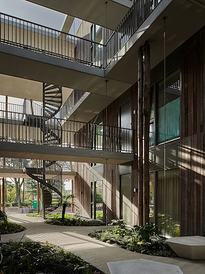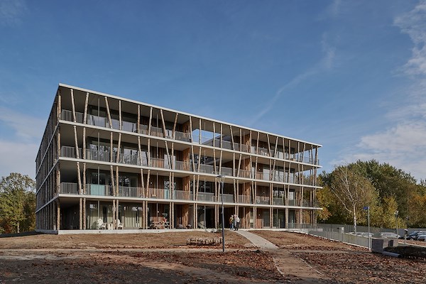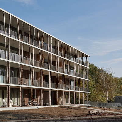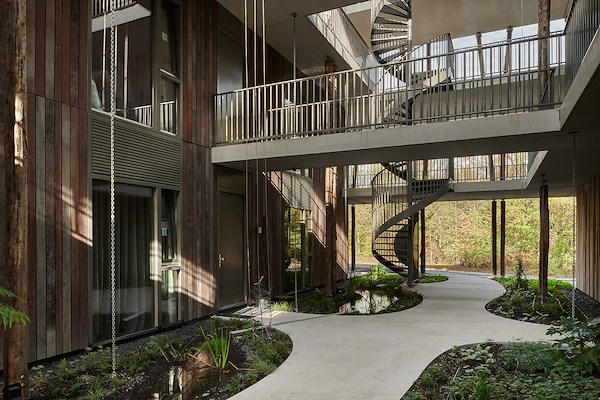 ontworpen gebouw met twintig appartementen opgeleverd. Het ontwerp is geïnspireerd op het Japanse gebruik Shinrin-yoku, waarbij je jezelf met al je zintuigen ‘onderdompelt’ in het bos om zo je lichaam en hoofd tot rust brengen. Gebouw Het Bosbad kent een hoge mate van circulair materiaalgebruik en is grotendeels demontabel.