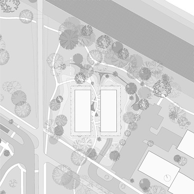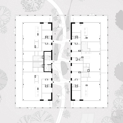 De woningen liggen vrij diep in het gebouw, zodat de privacy van de bewoners gewaarborgd blijft (het omringende park is openbaar toegankelijk), terwijl ze tegelijkertijd over royale buitenruimtes beschikken.