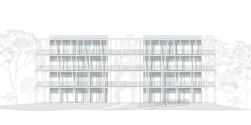 Colonnades van boomstammen en groene doorgang kenmerken woongebouw GAAGA