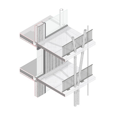 Ook is er veel op materiaalgebruik bespaard. In plaats van dikke betonvloeren met daarin gestorte leiding is gekozen voor kanaalplaten voor de woningen en voorgespannen betonelementen voor de balkons, wat beduidend dunnere vloeren opleverde.