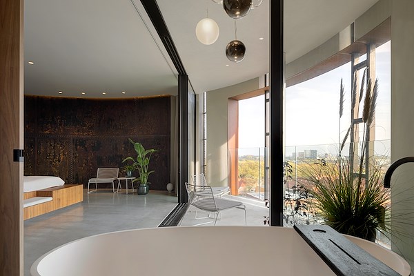 De zevende verdieping biedt als geheel plaats aan de hoofdslaapkamer met badruimte en kledingkamer. Hier is gekozen om een spectaculair uitzicht te geven op de (ontwakende) stad bij opkomende zon en de Domtoren in het centrum van Utrecht, zegt Zecc. Daartoe is een grote opening gemaakt in het vat en het metselwerk van de buitengevel.