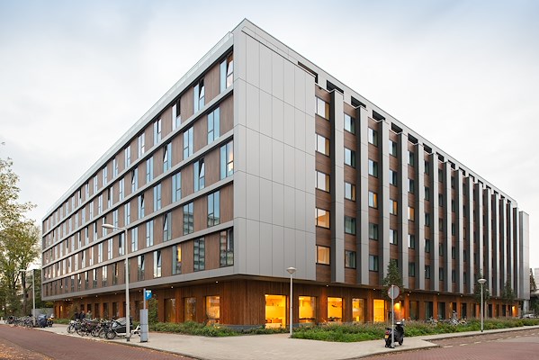 In de Delflandpleinbuurt in Amsterdam is een complex met 500 sociale-huurwoningen voor internationale studenten gerealiseerd. Om het geluid van de nabijgelegen A10 te weren ontwierp