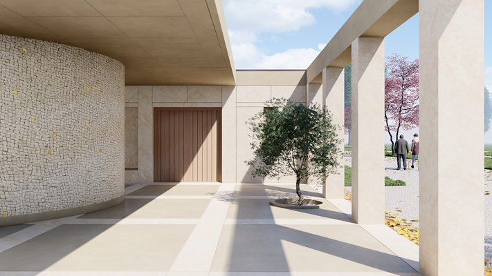Vanaf de zijde van de begraafplaats markeren twee stenen dozen, als contouren, het rouwhof. Een is hoog en ligt aan de buitenzijde en een is een laag en bevindt zich aan de kant van de hoofdentree. Een natuurstenen arcade geeft de toegang van het rouwhof aan.