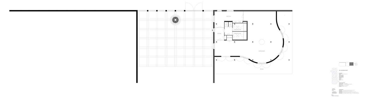 Het gebouw van de werkplaats bestaat functioneel uit twee delen onder een groot dak. Een deel behelst de keuken, kleedruimte, sanitaire voorziening en kantine. Het tweede deel is de feitelijke werkplaats, waarin ruimte voor voertuigen en opslag is voorzien. De buitenzijde is een gesloten stenen wand met glazen perforaties.