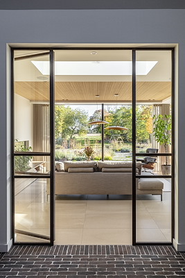 De glazen gevel vervult de wens van de opdrachtgevers om de tuin zoveel mogelijk te betrekken bij hun dagelijks leven. Vanuit de leefruimten hebben ze optimaal zicht op de ruime en diepe tuin en het Natura 2000-gebied daarachter. Een brede houten luifel omkadert de glazen gevel en zorgt voor beschaduwing.