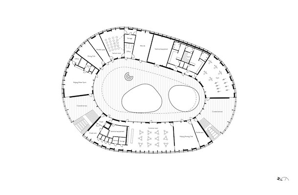 Het complex huisvest onderkomens voor onder meer roei-, duik- en zeilverenigingen. De verenigingsruimten en gedeelde faciliteiten liggen alle op de eerste verdieping, rond het publieke terras. Functies als opslagruimten voor boten en workshopruimtes liggen op de begane grond. Het centrale terras is via trappen vanuit de vier hoeken van het gebouw bereikbaar. Een van de trappen loopt rechtsreeks door naar de aanlegsteiger in het water.