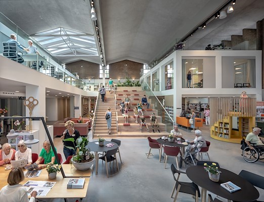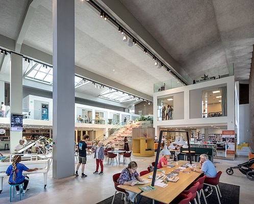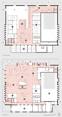 Op de begane grond liggen de bibliotheek de theaterzaal, een bar en een foyer. Op de trap kunnen kinderen zitten lezen. Op de rustiger verdieping liggen werk- en overlegplekken, daarnaast bevinden zich hier de oefenruimtes voor de harmonie. Het ontwerp is in overleg met de verschillende gebruikers tot stand gekomen, meldt INBO.
