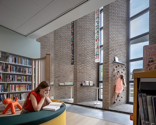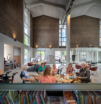Zo is de plint van het van oorsprong vrij introverte gebouw opengewerkt met glas, waardoor het een etalagefunctie bekleedt voor het theater en de bibliotheek. Doordat van buitenaf zichtbaar is wat er binnen gebeurt, wordt de drempel om naar binnen te gaan lager, luidt de achterliggende gedachte. In het dak is een lichtstraat aangebracht voor extra daglicht van bovenaf, de bestaande verticale ramen aan de zijkant van de kerk zijn behouden.