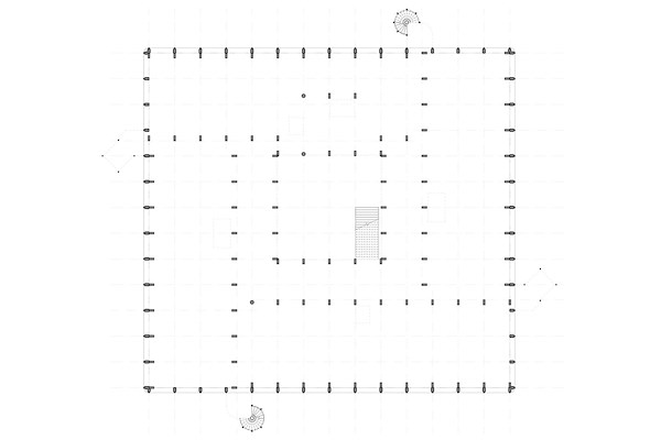 De hoofdopzet is bijzonder rationeel en rigide; een vierkante plattegrond is ingevuld met een grid uit eendere houtmodules. De overspanningen zijn kort en de afwijkingen in de opzet zijn tot een minimum beperkt.