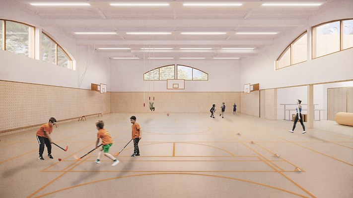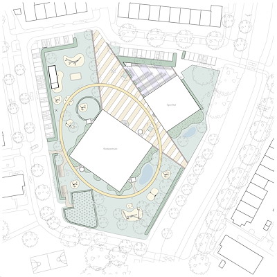 De architecten verdelen het programma in twee compacte vierkante volumes: een voor de sporthal en een voor de andere functies. Hierdoor maken ze optimaal gebruik van de groene omgeving, leggen de architecten uit; het groen vloeit tussen de gebouwen door. De groene buitenruimte loopt verder rondom de school en versterkt de verbinding tussen de woonbuurt en het park in de wijk.