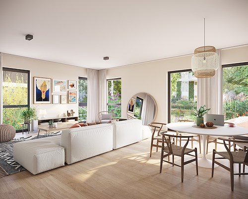 In de eerste gebouwen binnen het blok komen 25 stadswoningen, 52 appartementen en twee maisonnettes. De stadswoningen variëren in grootte van 160 tot 208 vierkante meter en hebben een privétuin die ‘organisch’ overloopt in de collectieve binnentuin van het blok. De appartementen zijn 58 tot 155 m² groot; de vier penthouses beschikken over een eigen tuin of balkon.