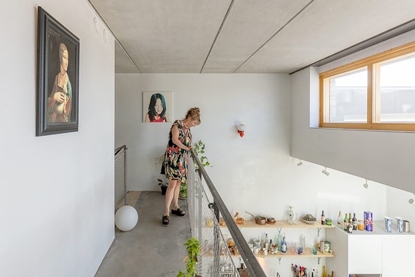 De route van de beneden gesitueerde woonverdieping naar de kamers op de hogere verdiepingen loopt via een loopbrug door de woonkeuken. Op die manier heeft Jan Bochmann Architecten de hoge ruimte van de woonkeuken voor de bewoners ook van bovenaf beleefbaar gemaakt. Dagelijks ervaren ze de zichtlijnen van boven naar beneden en vice versa, legt het architectenbureau uit.