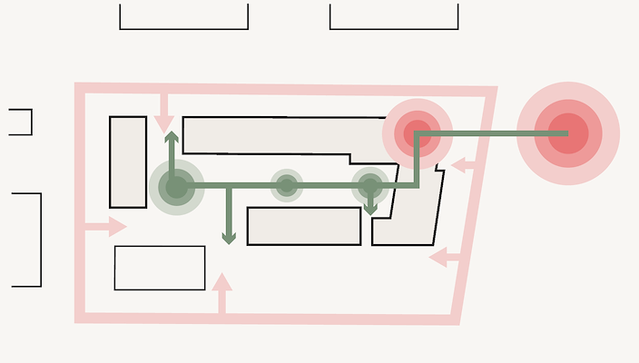 “Daaruit ontstond een massa met een getrapt volume als buffer naar het achtergelegen gebied. Door de hofstructuur ontstaat er op het maaiveld een geluidluwe gemeenschappelijke buitenruimte met daaraan de tuinen van de grondgebonden woningen.”