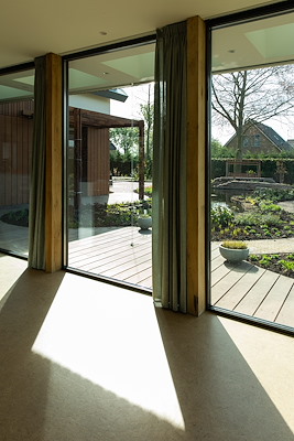 Op de begane grond is een goed toegankelijke slaapkamer met badkamer voorzien en alle doorgangen zijn breder dan gebruikelijk gemaakt. Daarmee is de woning levensloopbestendig ontworpen. Lange zichtlijnen door het huis eindigen steeds op de omringende tuin met de verschillende bomen. Vanuit elke plek in de woning is het contact met de groene omgeving voelbaar, aldus de architecten.