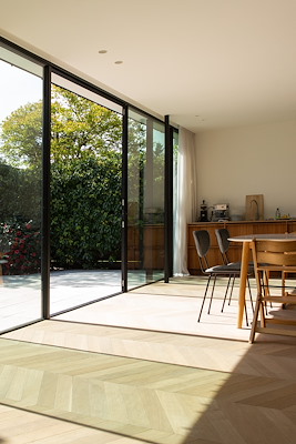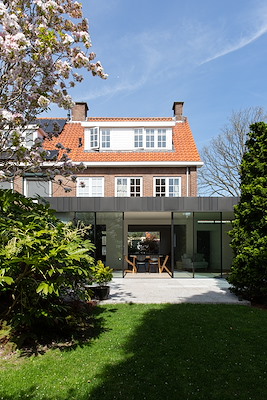 Aan de tuinzijde heeft het architectenbureau de begane grond uitgebreid over de volle breedte van de woning. Een glazen pui van vloer tot plafond, gevat in een minimalistisch profiel, verbindt interieur en buitenruimte.