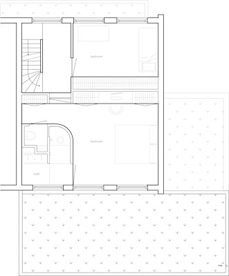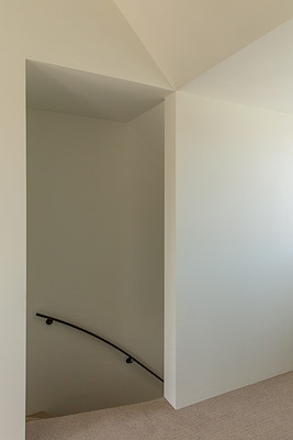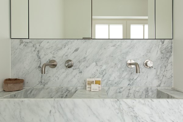 Op de verdieping is een ruimtescheidend volume gerealiseerd, waarin bergkasten en werkplekken zijn opgenomen. Op de eerste verdieping en zolder zijn ook nieuwe badkamers gerealiseerd. De badkamers zijn afgewerkt met Carrara-marmer, waarbij de doucheruimte met opvallende verticale, gebogen strepen.