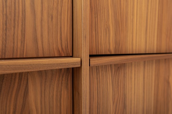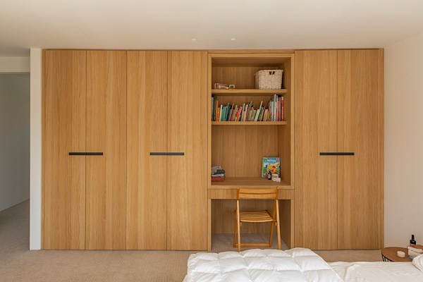 Eveneens op de begane grond ligt, achter een gebogen wand met een bandraam, de kantoorruimte in de voormalige garage. Passend bij de keuken in walnoot zijn de vloeren op de begane grond uitgevoerd in parket met Hongaarse punt-motief.
