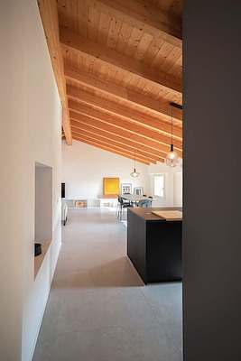 Rond het volume strekt zich voelbaar de lichte en doorlopende ruimte. Een toegevoegd raam tussen de keuken en het private trappenhuis geeft een doorzicht op het omliggende landschap.