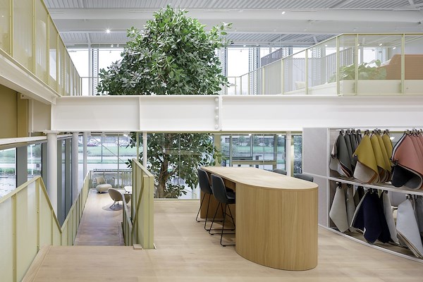 Ook valt vanaf hier het oog meteen op de mezzanine, geplaatst in het midden van het Experience Center. Met de tussenverdieping heeft het ontwerpbureau in het 12 meter hoge gebouw een intiemer aanvoelende plek willen creëren. Hier kunnen klanten meubelmodellen, kleuren en materialen kiezen.