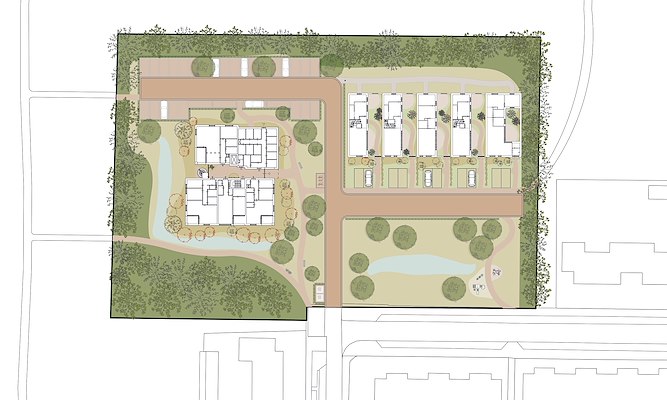 een compact ensemble van een appartementengebouw en een aantal patiowoningen ontworpen. Het architectenbureau heeft met het ontwerp nadrukkelijk aansluiting gezocht bij de bestaande architectuur en de dorpse context.