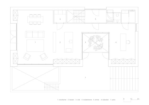 Onderin de woning is het licht gedempt, is de sfeer intiem en blijven de slaapvertrekken koel, laat Studio AAAN weten. De centrale gelegen patio structureert de ruimtes van de leeflaag en zorgt voor verrassende doorzichten. Ook is het groen van buitenaf voortgezet in deze patio en die in de hoek van de woning, in de vorm van losstaande planten.