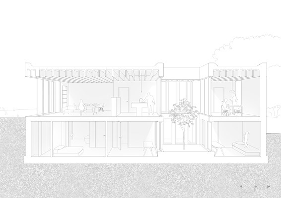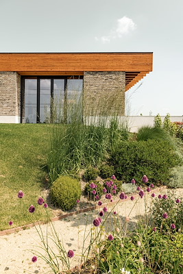 De verdieping met de leefruimtes is herkenbaar aan de bakstenen gevel en de houten overkapping. De balkenstructuur loopt in dwarsrichting door de woonkamer, keuken en studeerkamer heen en mondt uit in een luifel aan de zuidgevel. Ter plekke van de patio’s zijn openingen in het dak gecreëerd, zodat het daglicht kan doorstromen naar de verdieping die verscholen ligt in de terp.