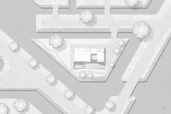 De woning ligt centraal op de kavel en wordt omgeven door de tuin. Dit maakt volgens Studio AAN dat het huis als een bescheiden volume op de terp staat. De onderste laag met slaapvertrekken ligt geheel in de terp en is onzichtbaar van buitenaf, al verraadt het betonnen deel van de gevel dat er nog een verdieping onder de laag met leefruimtes moet zijn.