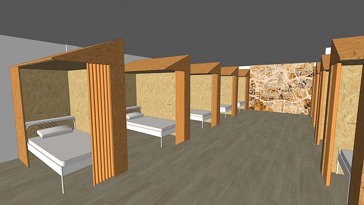 Om de gebruikers van de slaapzalen privacy te gunnen, heeft Bureau Kroner een speciaal bedmeubel ontworpen. De bedmeubels refereren in vorm naar een klein huisje en zijn gebeitst in dezelfde kleur als die van de slaapzaal. De meubels zijn geproduceerd van eenvoudige OSB-platen, die niet alleen betaalbaar zijn, maar ook verwijzen naar de tijdelijkheid van de nachtopvang.