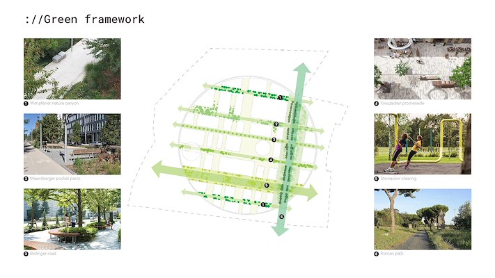 De basis van het masterplan wordt gevormd door twee groene assen die de cirkel doorsnijden waarvan één een historisch Romeins pad is dat de belangrijkste noord-zuidroute vormt. Rondom de campusgebouwen loopt een pad van 1,2 kilometer lengte. Een atletiekbaan, een skatepark, een tribune en uitzichtpunten op de omgeving zorgen voor een overgang naar het omliggende landschap en activering van de campus.