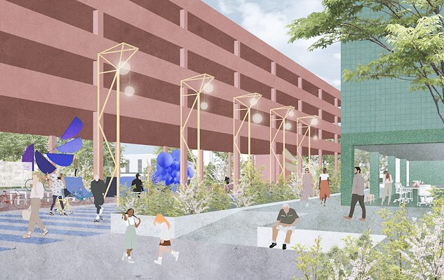 Een opvallend gebouw binnen het plan is de nieuwe ‘parkeerhub’. Door het gebouw zes meter van het maaiveld op te tillen, laten we de begane grond onder het gebouw open en onderdeel van de publieke ruimte”, melden Studioninedots en Karres en Brands.