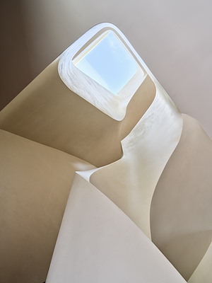 De verschillende verdiepingen zijn met elkaar verbonden via een sculpturaal ontworpen trappenhuis met wanden van beton-ciré. Een daklicht voorziet het trappenhuis en omliggende functies zoals de slaapkamers badkamers en logeerkamers (die in een carré zijn geplaatst) van daglicht. De traptreden zijn gemaakt van notenhout en voorzien van stootborden.