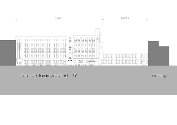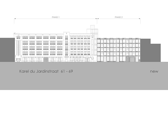 De nieuwbouw is geheel uitgevoerd in verticaal donker metselwerk met lange vormstenen, passend bij het historische straatbeeld van de Karel du Jardinstraat. Er zijn donkerbruine lange bakstenen gekozen die in een geavanceerd gelijmd prefab systeem de verticale articulatie van het ontwerp benadrukken.