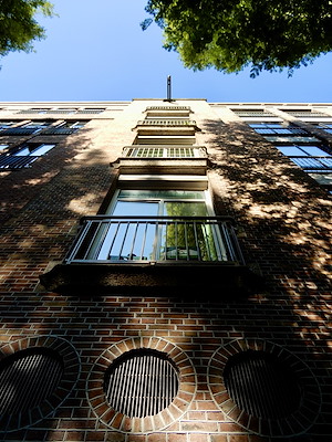 De bakstenen ‘kolommen’ die de balkons insluiten benadrukken eveneens het verticale karakter van de gevel en geven het gebouw een robuuste uitstraling, ondanks de grote ramen en de slanke vormgeving. De verticale textuur loopt vanaf de bovenkant door in de stenen plint waar het eindigt in een enkele rij stenen. Het ontwerp voldoet daardoor ook aan de eisen van de welstand dat de ramen worden afgesloten met een plint, net zoals het bestaande gebouw, meldt ZZDP.