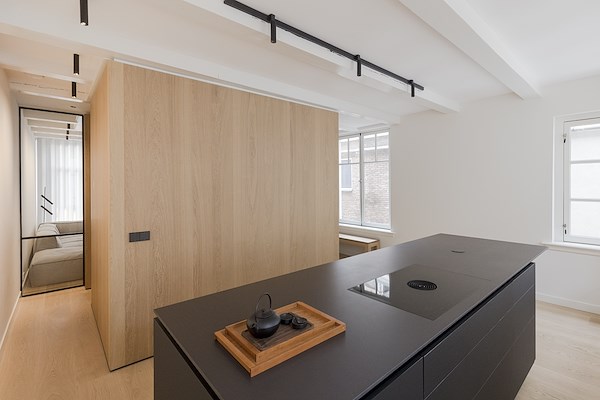 is een achttiende-eeuws grachtenpand in Amsterdam verbouwd en voorzien van een nieuw interieur. Inspiratiebron voor het ontwerp van de woning met werkruimte op de begane grond is Japans minimalisme, meldt het bureau. Bestaande elementen, zoals ramen, balken en spanten, zijn strikt gescheiden van het nieuwe interieur.