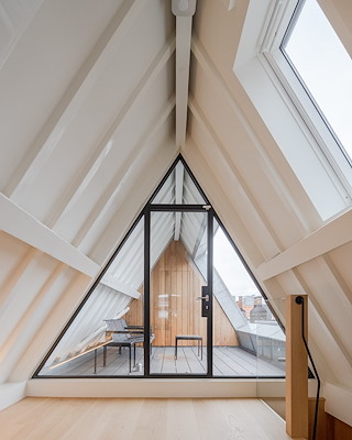 De zolder is ingericht voor ontspanning. Onder de nok ligt een sportruimte, die de bewoners direct binnenwandelt vanaf de trap. De nieuwe glazen scheidingswand voert naar een intieme dakpatio onder de kap die tevens een opbergruimte bevat.
