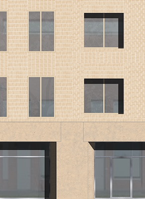 De gevels zijn opgedeeld in verschillende gevelvlakken, elk met een eigen baksteenpatroon, raamgrootte en neggediepte. Daarmee creëren de architecten een gelaagd gevelbeeld en een tussenschaal: tussen de grote schaal van het volume en de kleine schaal van de gevelopening.